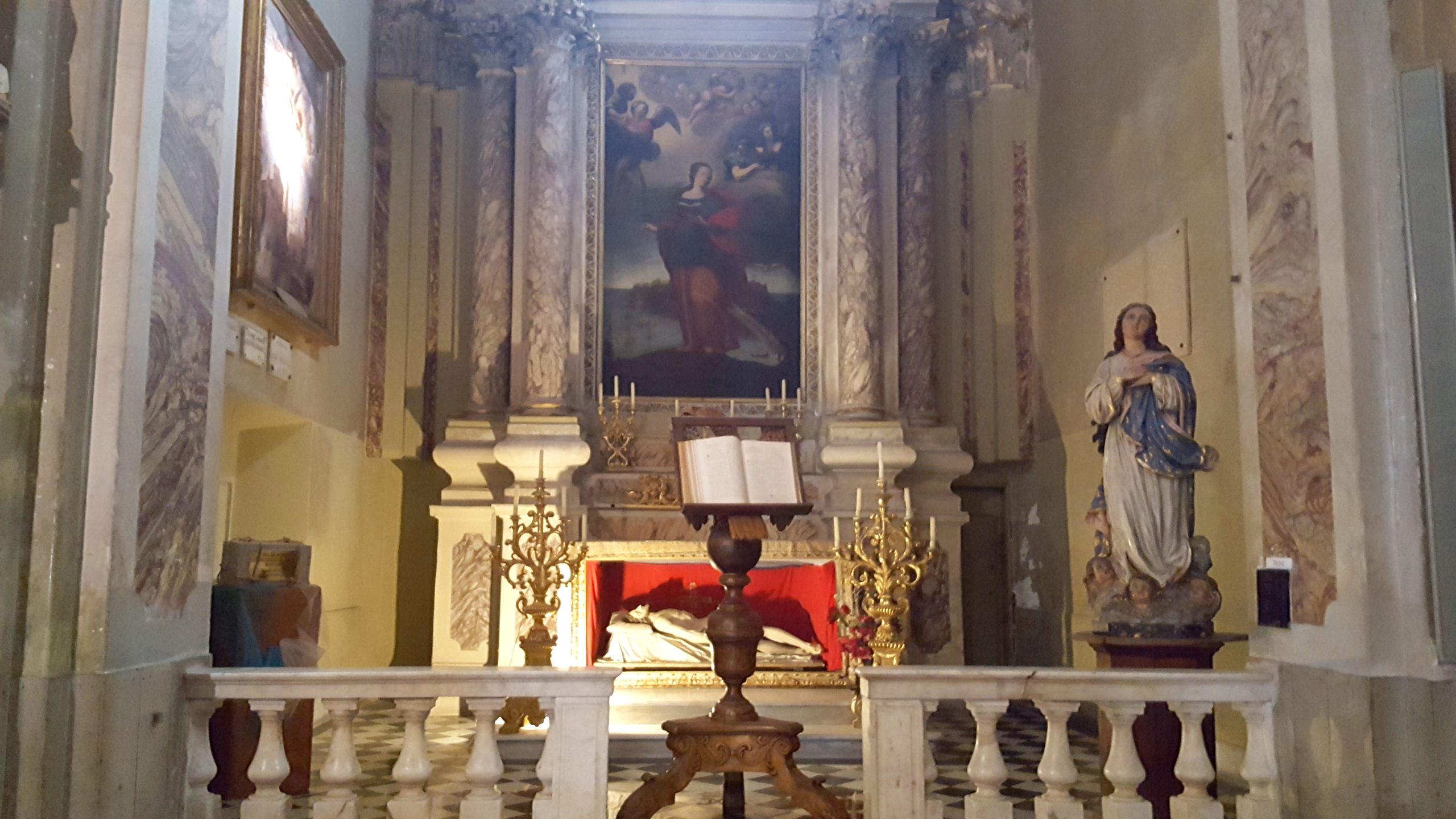W niszach znajdują się posągi Świętego Izydora i Świętego Elma (patrona marynarzy, piorunów, podróżujących po morzu i żeglarzy.Nad drzwiami wejściowymi znajduje płaskorzeźba Niepokalanego Poczęcia.Wyżej pomnik Świętego Karola Boromeusza. Na samej górze posągi Nadziei, Wiary i Miłosierdzia.