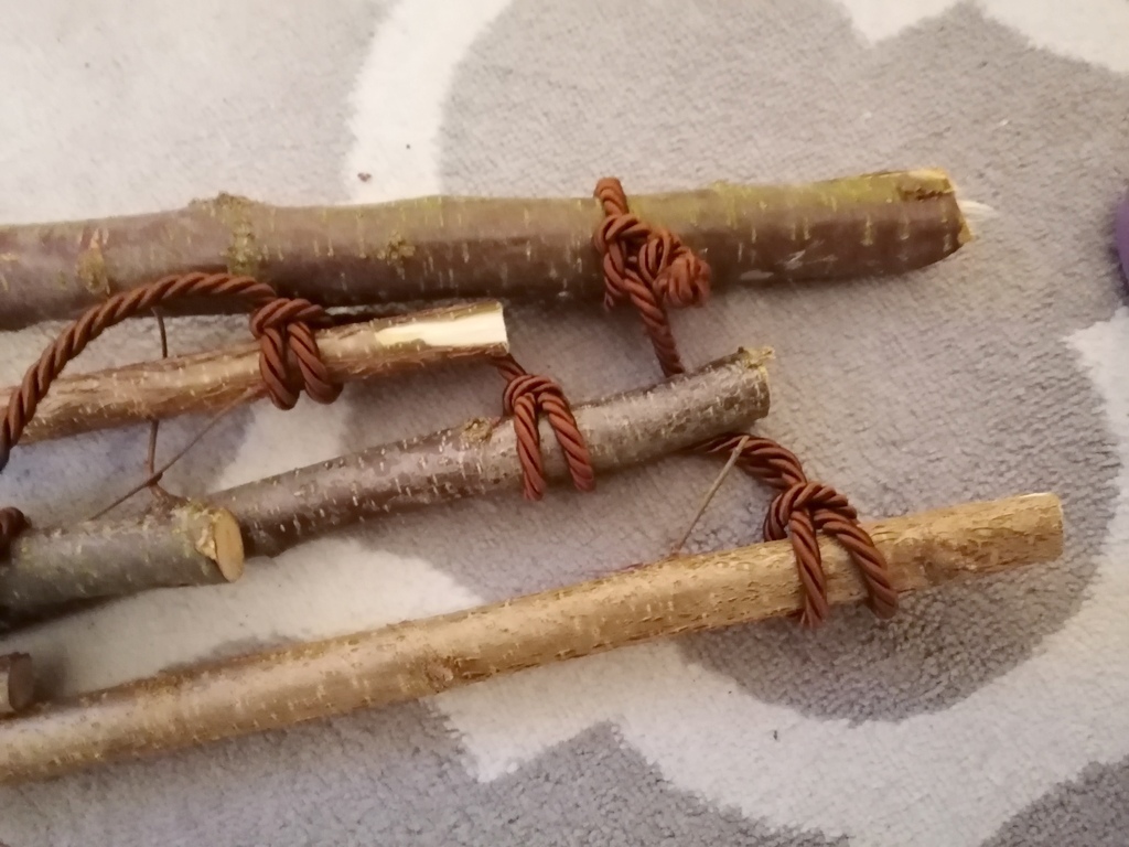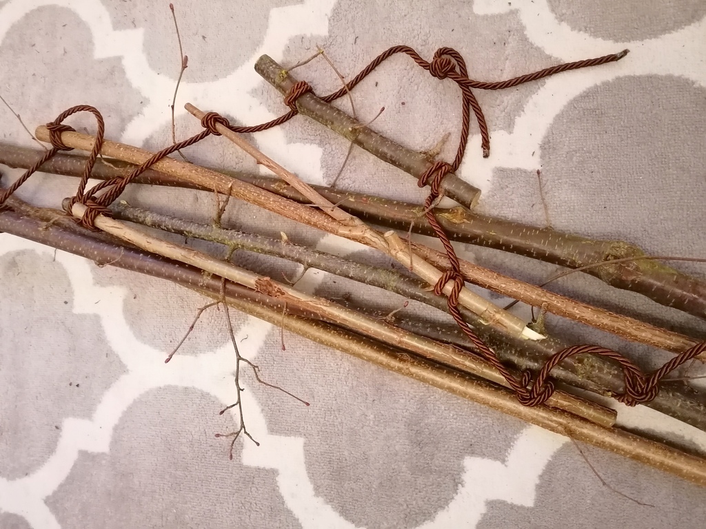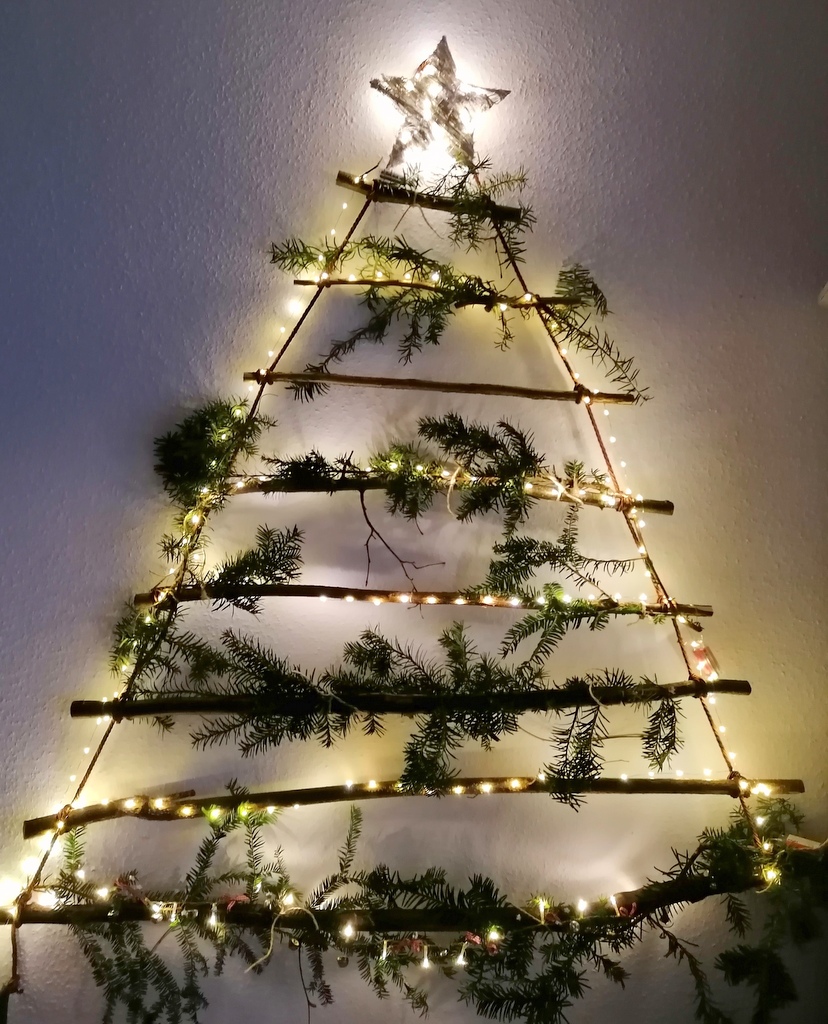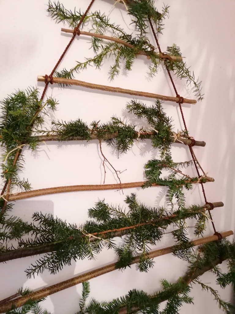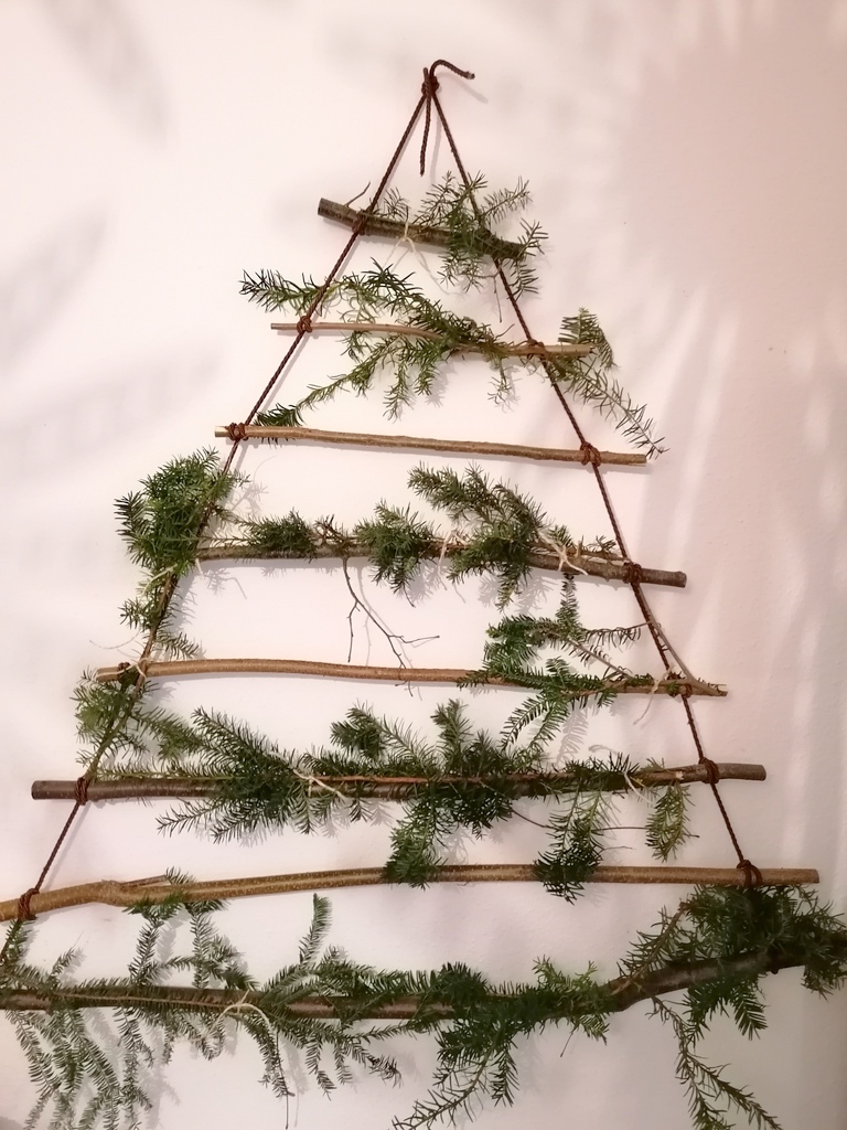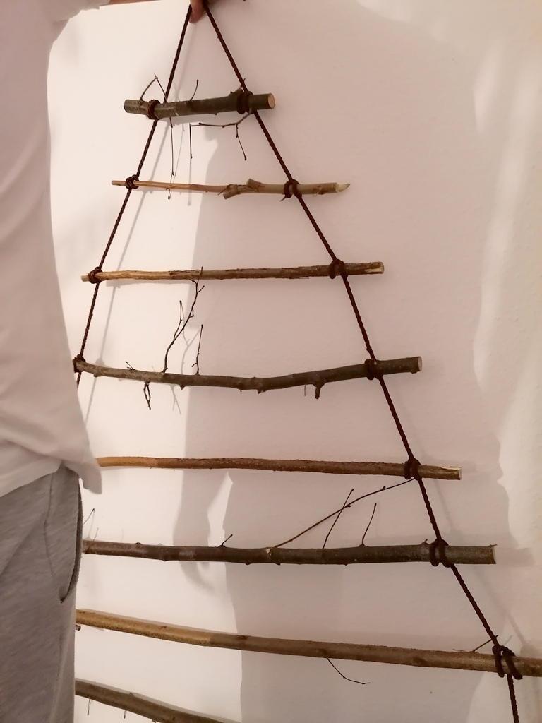 Choinka na zdjęciach poniżej została wykonana z 8 gałązek różnej długości i grubości. Przycinanmy według uznania, gałązki trochę sterczące na gałęziach można jak najbardziej pozostawić a choinka będzie wyglądać jeszcze bardziej naturalnie. Po ułożeniu na podłodze gałęzi w równej odległości od 10 do 15 cm (trzeba wziąć pod uwagę ozdoby jakie chcemy powiesić na choince). Po koleji łączymy gałęzie mocnymi supłami najlepiej w taki sposób który ułatwi nam poprawienie choinki na ścianie gdy wyjdzie nam trochę nierówno i się przekrzywi na ścianie. Nawet gdy uda nam się wszystko dobrze związać na podłodze to napewno będzie wymagało poprawy na ścianie. Całość wieszamy na zamontowanym haku. Następnie przeplatamy naszą choinkę tak jak chcemy gałązkami jodły czy świerku następnie mocujemy światełka i gwiazdę .