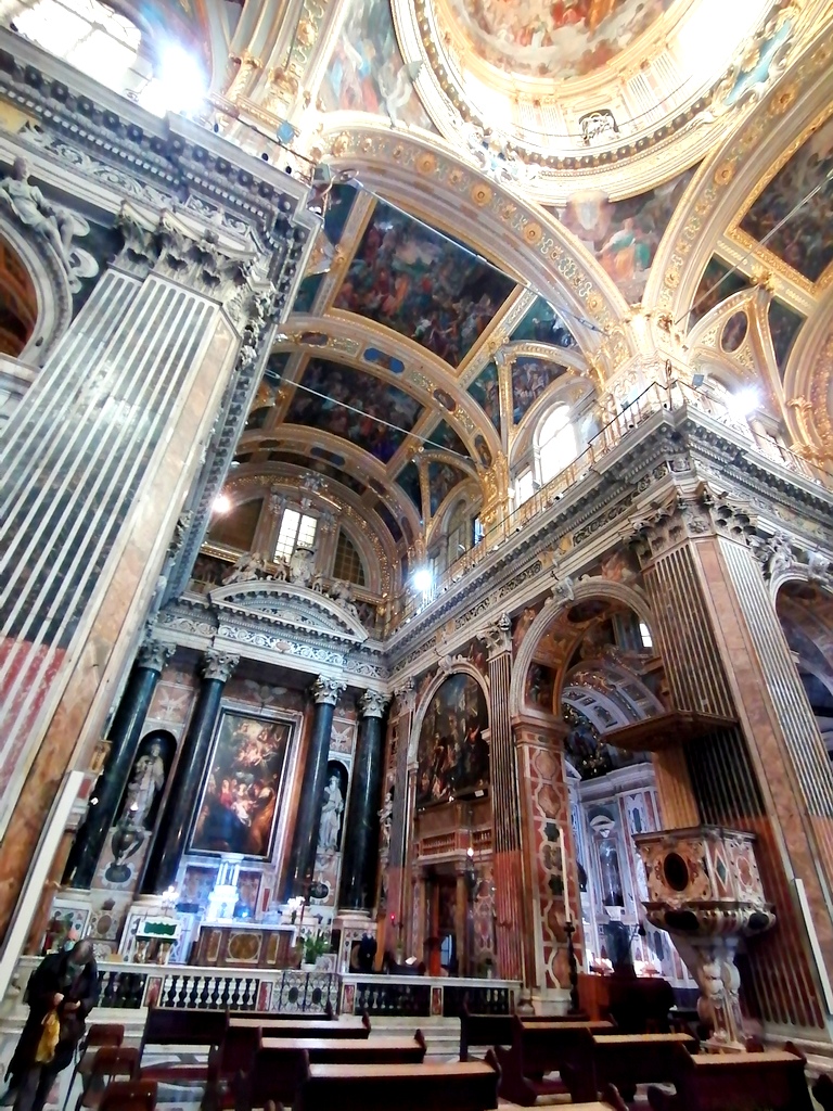 Wnętrze tego barokowego kościoła (Chiesa dei Santi Ambrogio e Andrea – kościół Świętych Ambrożego i Andrzeja) mieści dzieła Rubensa „Obrzezanie Pańskie” i „Cud św. Ignacego ” oraz ” Wniebowzięcie” Guido Reni. Dodatkowo samo wnętrze pełne złoceń i marmurów oraz zdobionych sufitów i fresków braci Giovanniego i Giovana Battisty Carlone jest niesamowite. Dodatowo odnajdziemy wiele innych wspaniałych fresków malarzy szkoły genueńskiej,między innymi :Valerio i Bernardo Castello, Giovanni Andrea i Lorenzo De Ferrari.