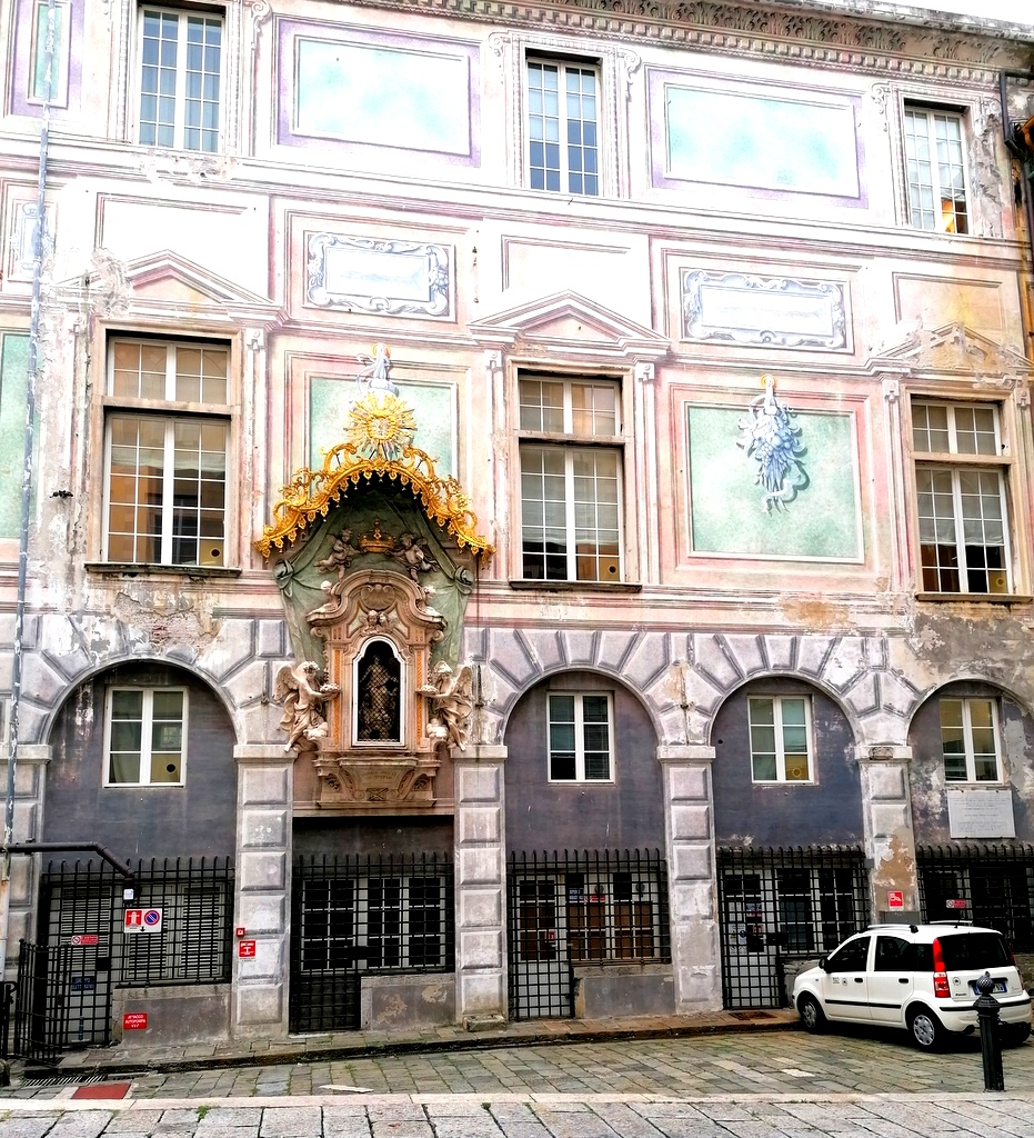 Obok Bazyliki znajduje się interesujący budynek ,obecnie jest tam powierzchnia sklepowa, knajpka i szkoła jazdy. Majestatyczna fasada, zwrócona w stronę placu katedralnego, została wzbogacona dodatkowo maskami umieszczonymi nad oknami przypominają maski z Palazzo Tursi, „dwuznacznie stylizowane na człowieka i bestię”. Wzmianki o budynku pochodzą już z 1614 roku.