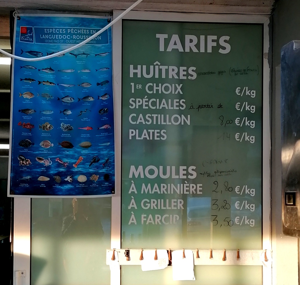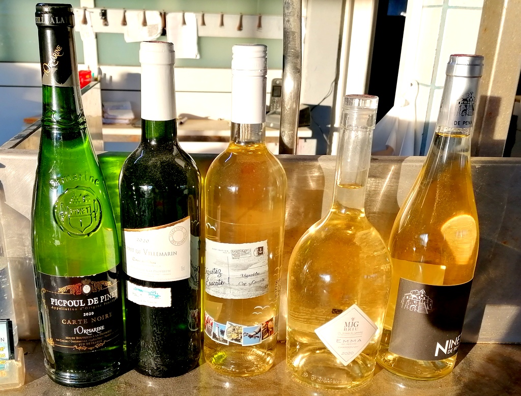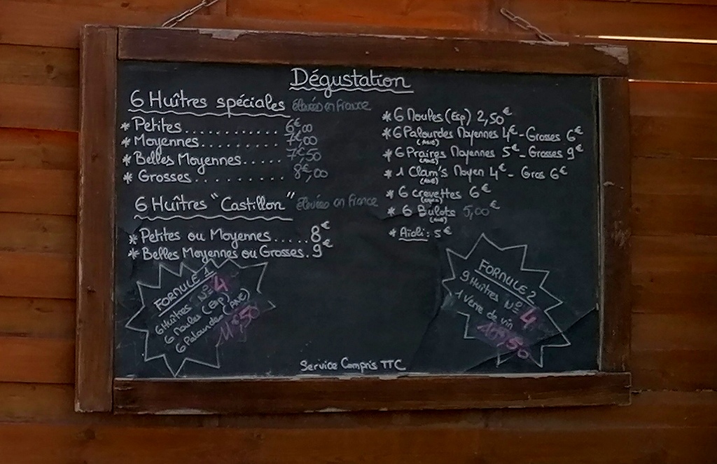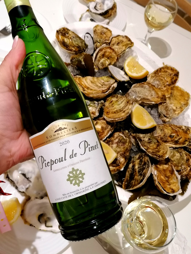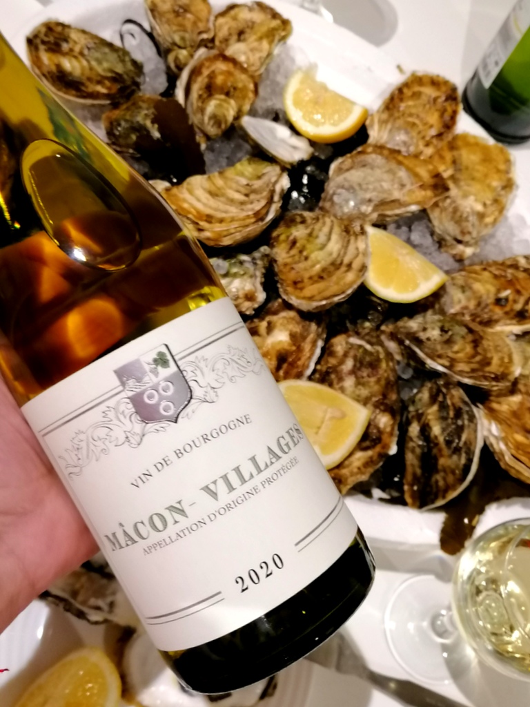 Ostrygi przygotowane przez szefa L’aquarium kosztowały około 30Euro za trzy rodzaje ostryg w sumie 18 sztuk (6 bardzo dużych , 6 średnich i 6 mniejszych + krewetki ). Do tego zakupiliśmy białe wino Piepoul de Pinet – Club de Sommelier i Macon Villages. Ostrygi są aromatyczne i słone. Zazwyczaj podaje się je z cytryną, posiekaną szalotką i octem z czerwonego wina.