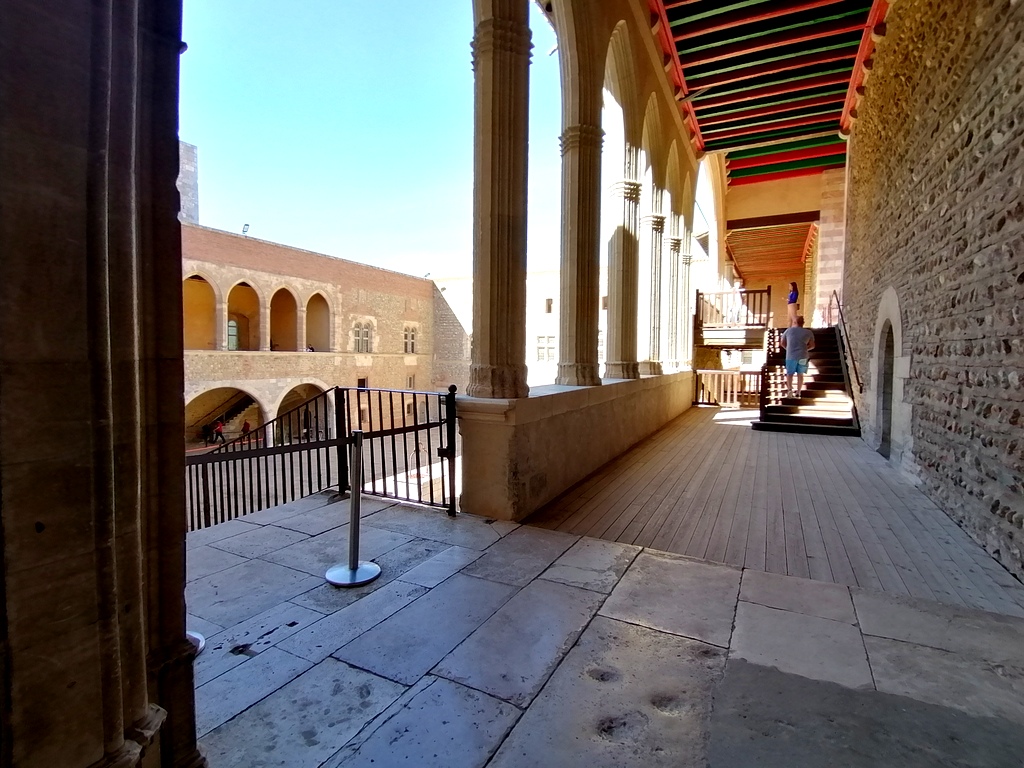 Udajemy się schodami mijając szerokie klatki schodowe i galerie w pokojach na piętrze. Mijamy ogromne pomieszcyenia ,niestety w większości puste : jadalnię króla ,salę tronową,sypialnie ,Salę Majorki, Kaplice Królewskie, loże królewską i inne pomieszczenia.