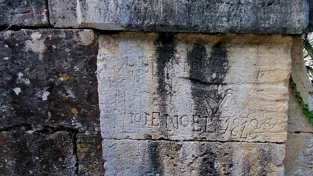 Na wielu kamieniach płytach odnajdziemy wiele wyrytych oznaczeń. Napisy nie tylko dawnych budowniczych akweduktu ale też ludzi odwiedzających dawno temu te miejsce. Daty, cyfry ,napisy i malunki z XVII/XVIII wieku.