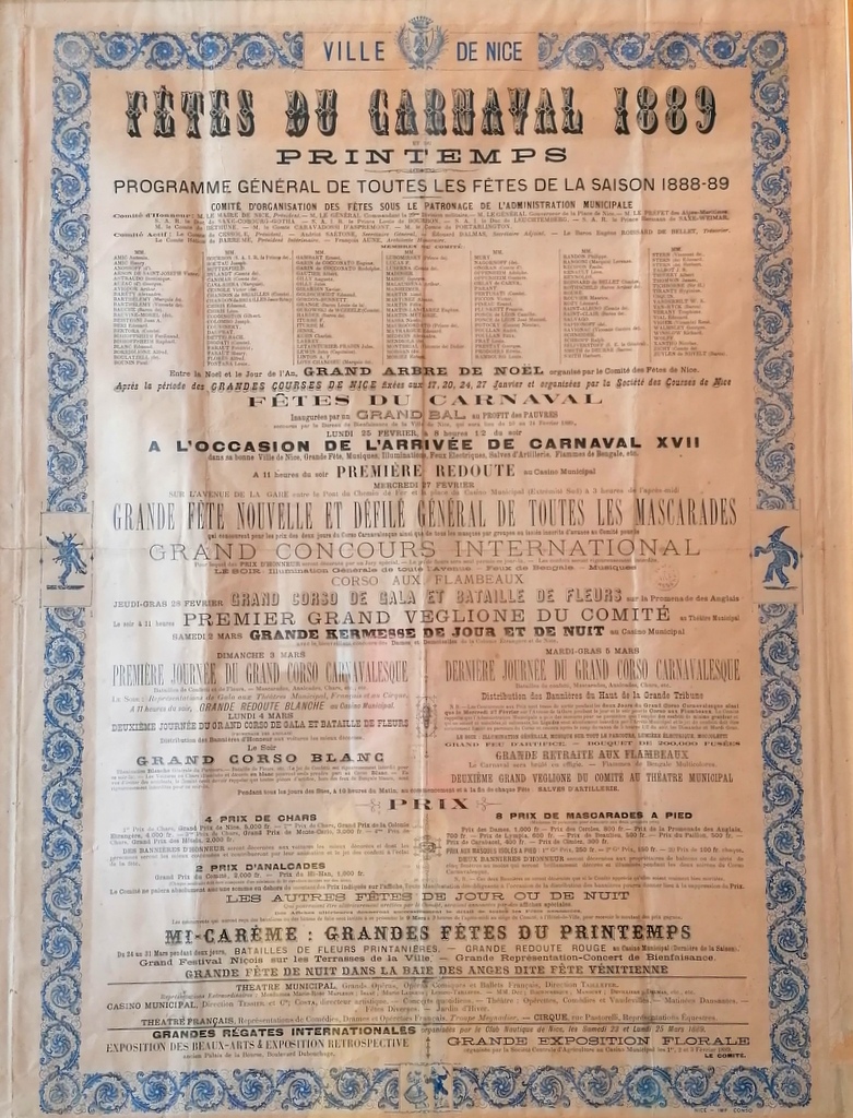 Karnawał w Nicei odbywa się każdego roku w lutym niekiedy jednak trwa jeszcze na początku marca (na przykład w roku 2024). Obok innych znanych karnawałów na świecie jak w Brazylii czy w WENECJI jest również ważnym wydarzeniem karnawałowym na świecie. W roku 2023 przypadła 150 rocznica karnawału w Nicei. Jednak są wzmiaki, że już w 1294 roku hrabia Prowansji Karol Anjou spędził radosne dni na karwale. Być może już wtedy próbowano stworzyć taki karnnawał. Do tego pomysłu wrócono jednak dopiero w 1873 roku. Obecnie odbywa się co roku oprócz lat w których trwała wojna lub inne ważne wydarzenie jak np. Covid19 w ostatnim czasie.