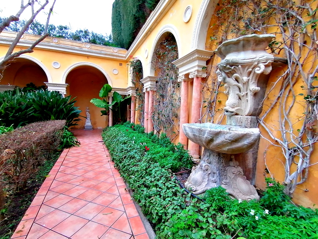 Po wejściu do wnętrza willi naszym oczom ukazuje się niesamowity wewnętrzny dziedziniec z arkadami. Po prawej stronie przy wejściu znajduje się Ołtarz ze św. Brygidą z Irlandii, po bokach z figurami św. Antoniego i św. Rocha. Masywne kolumny wykonano z różowego marmuru specjalnie sprowadzonego z Werony. Na tym wewnętrznym dziedzińcu znajdziemy dzieła ze średniowiecza i renesansu. Wspaniałe zdobione sufity możemy podziwiać dokładniej z pierwszego piętra,piękne łuki i zdobienia z żelaza.